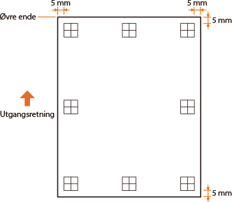 ut. Avgjør retningen og avstanden som må justeres ut ifra di merkene. Når utskriftsposisjonen er normal, skrives alle merkene 5 mm ut i en posisjon fra papirets nærmeste kant.