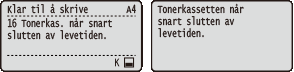 Når meldingen <Tonerkassetten når snart slutten av levetiden.> vises, har utskriftsjobben stoppet midlertidig. For å fortsette trykker du på  (  ). Meldingen som vises avhenger av <Handling v. advarsel>-innstillingen i innstillinger-menyen på betjeningspanelet. Handling v. advarselDu kan angi enhver verdi som prosenten gjenværende toner som aktiverer denne meldingen. Angi tonerktr.tid |