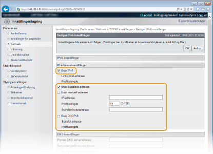 Klikk på [Rediger] i [IPv6-innstillinger].
