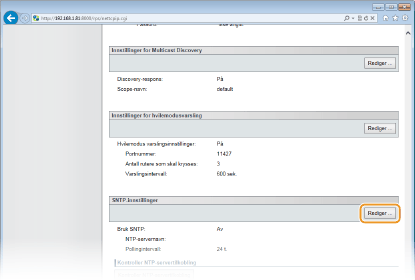 ![]() | Simple Network Time Protocol (SNTP) gjør at du kan justere systemklokken ved å bruke samme tidsserver på nettverket. Når du bruker SNTP, kontrollerer systemet tidsserveren regelmessig, slik at systemklokken alltid er oppdatert. |