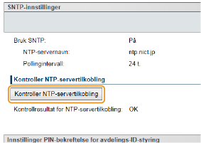 Teste kommunikasjon med NTP-/SNTP-serverenDu kan vise kommunikasjonsstatusen for den registrerte serveren ved å klikke på [Innstillinger/lagring] [Nettverk] [TCP/IP-innstillinger] og deretter [Kontroller NTP-servertilkobling] i [SNTP-innstillinger] som vises. Hvis en ordentlig tilkobling er opprettet, vises resultatet som vist nedenfor. Legg merke til at denne operasjonen ikke justerer systemklokken.![]() Velge innstillinger fra betjeningspaneletDu kan også aktivere eller deaktivere SNTIP-innstillingene via innstillinger-menyen på betjeningspanelet. SNTP |