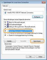 Velg [Internet Protocol versjon 4 (TCP/IPv4)] eller [Internett-protokoll]-avkrysningsboksen og klikk på [Egenskaper].