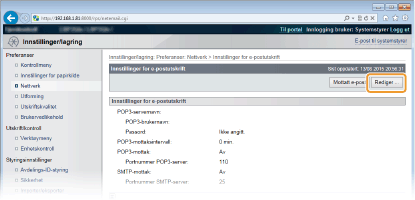 Dette avsnittet beskriver hvordan du angir innstillingene for mottak og utskrift av e-poster på denne maskinen. Bruk en datamaskin for å angi innstillingene for mottak av e-poster og maskinens betjeningspanel for å angi innstillingene for utskrift av e-poster.
