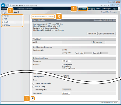 Viser [Boks]-siden. Du kan skrive ut og slette dokumenter som er lagret på maskinen. Skrive ut et dokument som er lagret i maskinen (utskrift av lagret jobb)