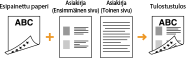 he <Paperinsyöttötapa> -asetusKun tulostat esipainetulle paperille, lisättävän paperin puoli on vaihdettava joka kerran, kun vaihdetaan 1- ja 2-puolisen tulostuksen välillä. Jos kohdan <Paperinsyöttötapa> asetuksena on <Tulostuspuoli etus.>, puolta, jota käytetään esipainetun paperin lisäämiseen 2-puolisessa tulostuksessa (logollinen puoli ylöspäin paperikasetissa tai alaspäin monikäyttöalustalla), voidaan käyttää myös 1-puolisessa tulostuksessa. Tämä asetus on erityisen hyödyllinen, jos tulostat usein sekä 1-puolisesti että 2-puolisesti. Paperinsyöttötapa |