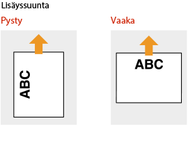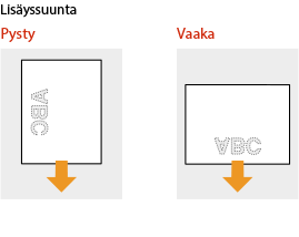 Tässä osassa kuvataan pääasiassa, miten esipainettu paperi lisätään oikein päin ja oikeassa suunnassa. Kuvaus yleisistä toimista, jotka on tehtävä lisättäessä paperia paperikasettiin tai monitoimitasolle, on alla. |