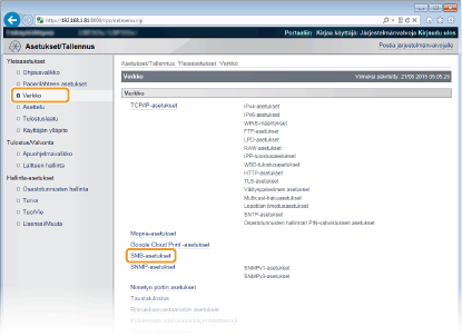 Käyttöpaneelin käyttäminenVoit ottaa SMB-palvelimen käyttöön tai pois käytöstä myös käyttöpaneelin asetusvalikosta. SMBVoit ottaa SMB-tulostuksen käyttöön tai pois käytöstä myös käyttöpaneelin asetusvalikosta. SMB |