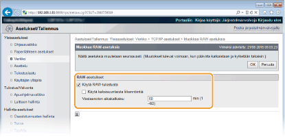 2 | Määritä asetukset tarpeen mukaan. ![]() [Käytä RAW-tulostusta] Valitse valintaruutu, jos RAW:tä käytetään tulostukseen. Jos sitä ei käytetä, tyhjennä valintaruutu. [Käytä kaksisuuntaista liikennöintiä] Valitse valintaruutu, jos käytetään kaksisuuntaista tiedonsiirtoa ilmoittamaan laitteen tila ja tulostuksen valmistuminen tietokoneelle. Jos sitä ei käytetä, tyhjennä valintaruutu. [Vastaanoton aikakatkaisu] Aseta ajanjakso, jonka kuluttua tulostustyö päättyy automaattisesti, kun tulostustietoja ei voida vastaanottaa tiedonsiirtovirheen tai jonkin muun ongelman takia. |