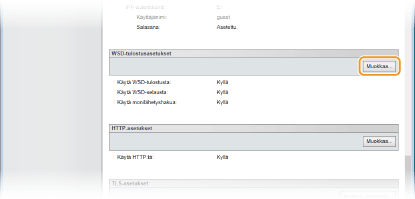 2 | Määritä asetukset tarpeen mukaan. ![]() [Käytä WSD-tulostusta] Valitse valintaruutu, jos WSD:tä käytetään tulostukseen. Tyhjennä valintaruutu, jos sitä ei käytetä. [Käytä WSD-selausta] Valitse valintaruutu, kun haluat hakea laitteen tiedot tietokoneesta WSD:n avulla. Tämä valintaruutu valitaan automaattisesti, kun [Käytä WSD-tulostusta] -valintaruutu on valittu. [Käytä monilähetyshakua] Valitse tämä valintaruutu, kun haluat asettaa laitteen vastaamaan monilähetyshaun pyyntöihin. Jos valintaruudun valinta poistetaan, laite pysyy lepotilassa myös silloin, kun verkossa on monilähetyshaun pyyntöjä. |