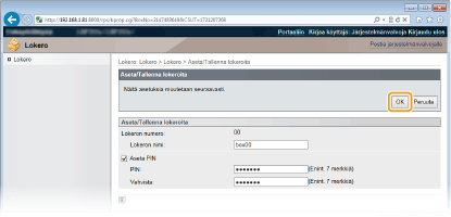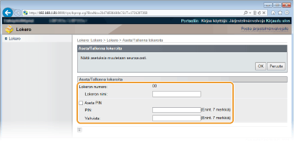 Kun haluat määrittää PIN-koodin, valitse [Aseta PIN] -valintaruutu ja syötä numero PIN-koodia varten [PIN]-tekstiruutuun. Syötä vahvistukseksi sama numero [Vahvista]-tekstiruutuun.