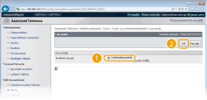 Avainpari voidaan luoda laitteen avulla, kun sitä vaaditaan salattuun TLS (Transport Layer Security) -tiedonsiirtoon. Voit käyttää TLS-salausta, kun laitetta käytetään etäkäyttöliittymällä tai suoritetaan IPP-tulostus. Laitteeseen voidaan tallentaa enintään kahdeksan avainparia, esiasennetut parit mukaan lukien. Itse allekirjoitettuja varmenteita käytetään kohdassa Verkkotietoliikenne luotujen avainparien kanssa. Avaimen ja varmenteen allekirjoituspyyntö (CSR) -kohdassa voit hakea CA-myönnettyä digitaalista varmennetta laitteen muodostamalle avainparille.