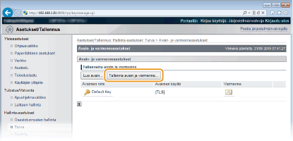 Avainparia ei voi poistaa, jos se on käytössä, esimerkiksi kun [TLS] tai [IEEE 802.1X] näytetään kohdassa [Avaimen käyttö]. Poista tässä tapauksessa toiminto käytöstä tai vaihda avainpari ennen sen poistamista. Esiasennettua CA-varmennetta ei voi poistaa.