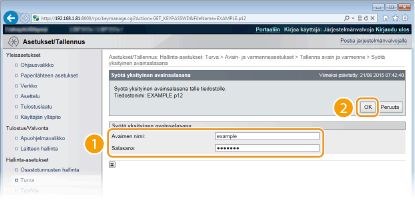 2 | Syötä avainparin nimi ja salasana ja valitse [OK]. [Avaimen nimi] Syötä tallennettavan avainparin nimi aakkosnumeerisilla merkeillä. [Salasana] Syötä tallennettavan tiedoston yksityisten avainten joukon salasana aakkosnumeerisilla merkeillä. |