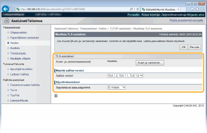 3 | Valitse [Käytä TLS:ää] -valintaruutu ja valitse [OK]. [Käytä TLS:ää] Valitse valintaruutu, kun käytetään TLS:ää etäkäyttöliittymän tiedonsiirtoon. Tyhjennä valintaruutu, kun sitä ei käytetä. |