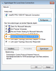 Markera kryssrutan [Internet Protocol Version 4 (TCP/IPv4)] eller [Internetprotokoll] och klicka på [Egenskaper].