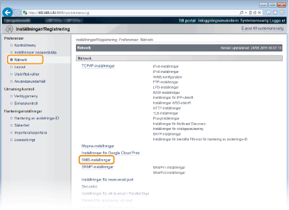 Använda kontrollpanelenDu kan även aktivera eller inaktivera SMB-servern på kontrollpanelens inställningsmeny. SMBDu kan även aktivera eller inaktivera SMB-utskrift på kontrollpanelens inställningsmeny. SMB |