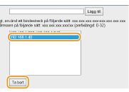 2 | Ange adressundantag. Ange IP-adressen (eller ett intervall med IP-adresser) i [Registrera adress]. Markera kryssrutan [Ange portnummer] när du vill ange portnummer. Ange ett portnummer i [Portnummer] och klicka på [Lägg till]. Söka efter inmatningsfel Om IP-adresserna eller portnumren inte är rätt angivna kan det bli problem med att få åtkomst till enheten från fjärranvändargränssnittet. I så fall behöver du ange <Adressfilter> till <Av>. AdressfilterTa bort ett angivet portnummer Välj portnumret som ska tas bort och klicka på [Ta bort]. |