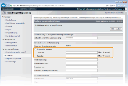 Om inställningarna för enheten ska göras från fjärranvändargränssnittet krävs administratörsbehörighet. Följ anvisningarna nedan när du vill ändra lösenordet för systemansvarig. Informationen om systemansvarigs lösenord är viktig för enhetens säkerhet, varför endast administratörer får känna till detta lösenord.