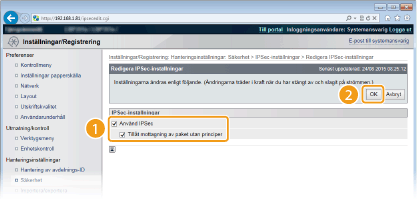 Om du markerar kryssrutan när du använder IPSec kommer även paket som inte är tillgängliga för registrerade policyer att skickas och tas emot. Avmarkera kryssrutan om du inte vill skicka/ta emot paket som inte är tillgängliga för policyerna.