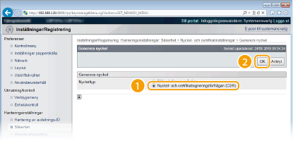 Ett nyckelpar kan genereras med enheten när det behövs för krypterad kommunikation via TLS (Transport Layer Security). Du kan använda TLS när enheten ska hanteras via gränssnittet för fjärranvändning eller vid IPP-utskrift. Upp till åtta nyckelpar, inklusive förinstallerade par, kan registreras. Självsignerade certifikat används med nyckelpar som har genererats i "Nätverkskommunikation". Med en "Nyckel och certifikatsigneringsförfrågan (CSR)" kan du ansöka om ett CA-utfärdat digitalt certifikat för nyckelparet som har genererats av enheten.