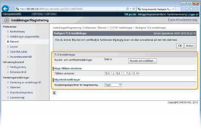 Om TLS redan är aktiverat genom [Inställningar för fjärranvändargränssnitt] eller [Inställningar för IPP-utskrift] visas inte [Standardnyckelinställningar]. Se steg 6 om du vill byta nyckel och avmarkera kryssrutorna [Använd TLS] under [Inställningar för fjärranvändargränssnitt] respektive [Inställningar för IPP-utskrift].
