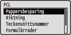 ![]() | Alla inställningar för PCL-kontrollkommandon visas med korta beskrivningar. Standardinställningarna är markerade med ett kors ( ). |