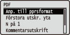 | Alla inställningar för PDF-filer som kan skrivas ut med USB-direktutskrift och direktutskrift visas med korta beskrivningar. Standardinställningarna är markerade med ett kors (  ). |