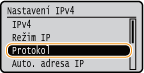 Můžete použít pouze jeden z protokolů DHCP, BOOTP a RARP. Pokud je vybraný protokol nastaven na <Zap>, další dva protokoly se automatiky nastaví na <Vyp>.