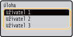 Jsou-li na kartě SD uloženy zabezpečené dokumenty od dvou či více uživatelů, před objevením se obrazovky ukázané výše se objeví obrazovka uživatelské volby zobrazená dole. Vyberte své uživatelské jméno a stiskněte
