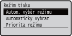 Zařízení přejde do režimu automatického výběru, když je možnost <Automatický výběr> vybrána pro <Autom. výběr režimu>. Zařízení automaticky rozliší data odeslaná z počítače a vybere režim tisku. Tento režim běžně používejte při tisku z aplikace.