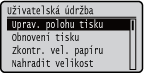 Nastavení týkající se úpravy zařízení, včetně korekce pozice tisku pro každý zdroj papíru a zlepšení kvality tisku, jsou uvedeny s krátkými popisy. Tato nastavení můžete zadat, když je zařízení offline. Výchozí nastavení jsou označena křížkem (