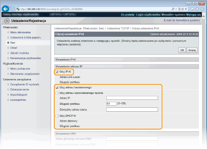 Adresy IPv6 urządzenia można skonfigurować za pomocą Remote UI (Zdalny interfejs użytkownika). Przed rozpoczęciem konfiguracji adresów IPv6 należy sprawdzić ustawienia adresu IPv4 (Ustawianie adresu IPv4). Aby korzystać z adresów IPv6, należy poprawnie skonfigurować ustawienia adresu IPv4. Urządzenie może korzystać z następujących wielu adresów IPv6: