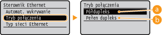 Naprzemiennie wysyła i pobiera dane komunikacyjne. Opcję tę należy wybrać, gdy urządzenie jest podłączone do urządzenia sieciowego w trybie półdupleks.