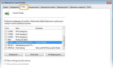 Nie można usunąć portu, który aktualnie jest skonfigurowany jako port drukarki. Aby usunąć ten port, wybierz inny port i kliknij przycisk [Zastosuj], aby skonfigurować go jako nowy port drukarki, a następnie usuń oryginalny port.
