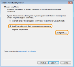 Wybierz pozycję [Umieść wszystkie certyfikaty w następującym magazynie] i kliknij przycisk [Przeglądaj].