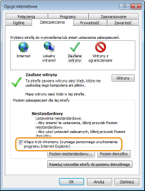 Jeśli w punkcie 7 usunięto zaznaczenie pola wyboru [Włącz tryb chroniony (wymaga ponownego uruchomienia programu Internet Explorer)], zaznacz je.