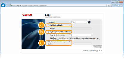 Wybierz pozycję [Tryb zarządzania] albo [Tryb użytkownika ogólnego], a następnie wprowadź odpowiednią wartość w polu [Kod PIN dostępu do zdalnego interfejsu użytkownika].