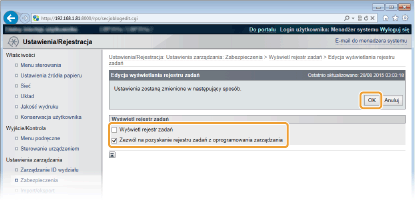 Gdy to pole wyboru jest zaznaczone, można użyć oprogramowania do zarządzania urządzeniami, takiego jak iW Management Console, aby uzyskać historię drukowania zadań. Aby wyłączyć uzyskiwanie historii drukowania zadań przez oprogramowanie do zarządzania, należy usunąć zaznaczenie tego pola. Gdy pole wyboru [Wyświetl rejestr zadań] jest zaznaczone, funkcja ta jest automatycznie włączana.