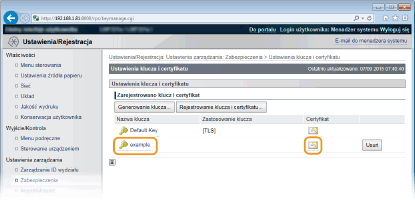 Kliknij [Nazwa klucza] lub [Certyfikat], aby zarejestrować certyfikat.