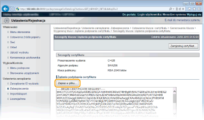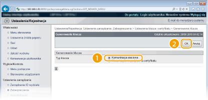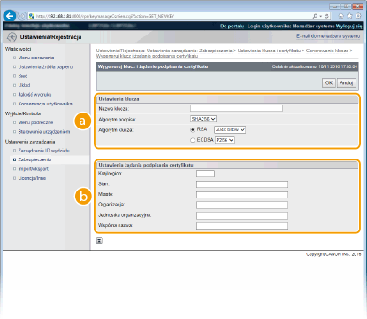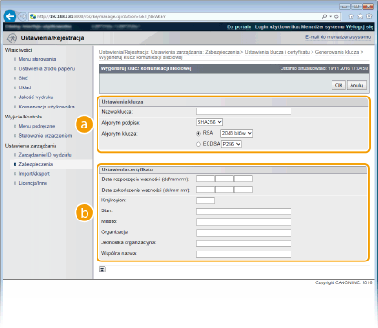 Parę kluczy można wygenerować za pomocą urządzenia, jeżeli wymaga tego komunikacja szyfrowana z użyciem protokołu TLS (Transport Layer Security). Z protokołu TLS można korzystać podczas udzielania dostępu do urządzenia przez zdalny interfejs użytkownika lub drukowania IPP. Można zarejestrować maksymalnie osiem par kluczy, w tym kluczy zainstalowanych fabrycznie. Wraz z parami kluczy wygenerowanymi dla łączności sieciowej używane są certyfikaty z podpisem własnym. Wraz z kluczem i żądaniem podpisania certyfikatu (CSR) można wysłać wniosek o certyfikat cyfrowy CA dla pary kluczy wygenerowanej przez urządzenie.