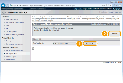 Kliknij przycisk [Przeglądaj] w oknie [Ścieżka do pliku], wybierz plik żądania podpisania certyfikatu, a następnie kliknij przycisk [Zarejestruj].