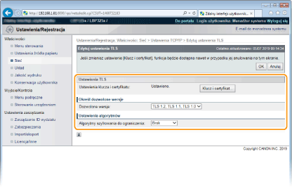 Gdy włączono protokół TLS za pomocą opcji [Ustawienia zdalnego interfejsu użytkownika] lub [Ustawienia wydruku IPP], opcja [Ustawienia klucza domyślnego] nie wyświetla się. Aby zmienić używany klucz, przejdź do punktu 6 i usuń zaznaczenie pól wyboru [Użyj TLS] w odpowiednio sekcji [Ustawienia zdalnego interfejsu użytkownika] lub [Ustawienia wydruku IPP].