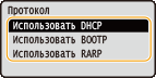 Можно использовать только один из протоколов DHCP, BOOTP и RARP. Если для выбранного протокола задано значение <Вкл.>, для остальных двух протоколов автоматически устанавливается значение <Выкл.>.