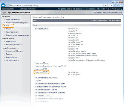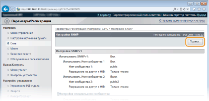 Отключение SNMPv1При отключении SNMPv1 некоторые функции аппарата будут недоступны (например, получение сведений об аппарате через драйвер принтера). Использование панели управленияДоступ к настройкам SNMP также возможен из меню настройки на панели управления. Настройки SNMP |