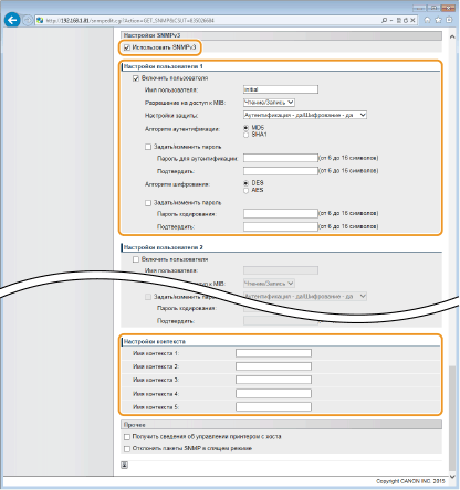 Простой протокол сетевого управления (SNMP) представляет собой протокол для мониторинга и контроля устройств связи в сети с помощью базы данных MIB. Аппарат поддерживает версию протокола SNMPv1 и версию с расширенными функциями безопасности SNMPv3. Статус аппарата можно проверить с помощью компьютера при печати документов или использовать для этого Удаленный ИП. Можно разрешить использование SNMPv1 или SNMPv3 по отдельности или одновременно. Укажите настройки для каждой версии в соответствии с особенностями сетевой среды и конкретными задачами.