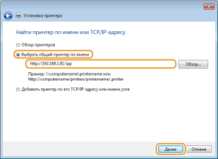 Выберите [Выбрать общий принтер по имени], введите адрес подключения и нажмите [Далее].