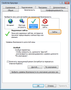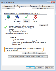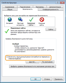 Снимите флажок [Включить защищенный режим (потребуется перезапуск Internet Explorer)], если он установлен.