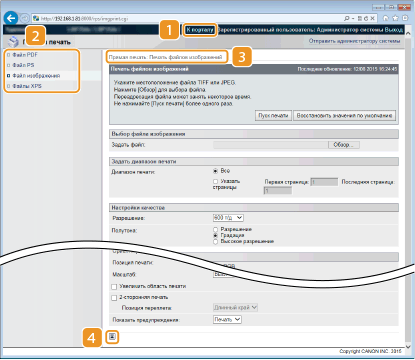Отображает страницу [Монитор состояния/Отмена]. На этой странице можно проверить текущее состояние печати, отменить обработку печати и посмотреть журнал заданий печати.