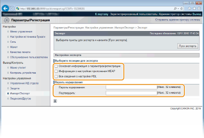 Чтобы экспортировать данные настроек, которые можно задавать с помощью пункта [Параметры/Регистрация] на странице портала, установите флажки для этих элементов.
