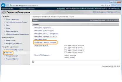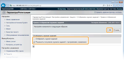 Если этот флажок установлен, для получения журнала заданий печати можно использовать программное обеспечение управления устройствами, такое как iW Management Console. Снимите этот флажок, чтобы программное обеспечение управления не могло получать журнал заданий печати. Эта функция автоматически включается при установке флажка [Отображать журнал заданий].